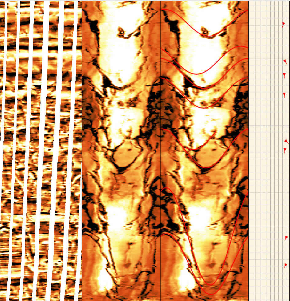 The Acoustic Borehole Imager produces high-resolution acoustic images of the wellbore in water-base or oil-base mud. The images are used to identify dipping beds, fractures, and other features intersecting the borehole. Critical information on borehole stability and breakouts can be derived from the accurate borehole cross section measured by the tool.